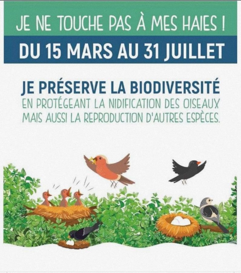 Nous vous informons que la période de nidification des oiseaux débute prochainement. Afin de préserver la biodiversité et de protéger la faune locale, nous vous remercions de ne pas tailler, couper ni intervenir sur les haies et arbustes du 15 mars au 31 juillet.